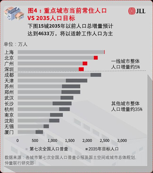 值得關注的是,中國部分二線頭部城市將在引導和管控的基調上,迎來常住人口規(guī)模的進一步增長。人口的增長將體現在對城市空間、資源和服務的需求的增長,轉化為空間規(guī)劃和開發(fā)機遇。具體而言,根據各城市規(guī)劃數據,中國排名前15強城市至2035年常住人口總增量預計將達到4,633萬(與2021年發(fā)布的第七次人口普查數據相比,如下圖4可見)。