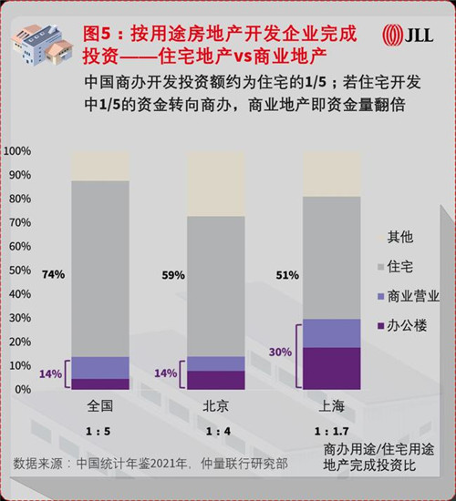 提及房地產,市場的關注度和資源往往集中在住宅領域。2020年,全國商辦用途的地產投資額僅占房地產總投資額的14%,而住宅投資占74%,即商辦地產與住宅地產的投資比約為1:5。盡管北京商業(yè)地產表現突出,但受到城市規(guī)劃和供應政策限制,北京商辦地產開發(fā)投資占比與全國一致,商辦住宅投資比為1:4。與此同時,上海商辦用途投資占比達到30%水平,商辦住宅投資比為1:1.7,也印證了一般情況下,商務氛圍更加濃郁、經濟活動更加活躍的頭部城市,商業(yè)地產投資量往往更大。