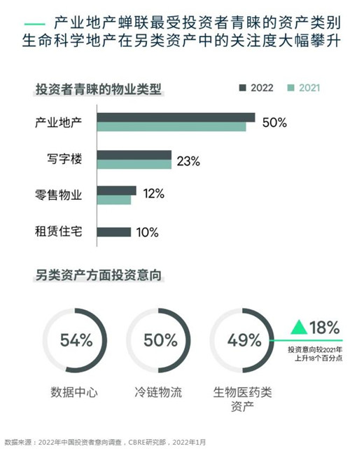 另類資產方面,數(shù)據中心持續(xù)獲得投資者關注,并在2022年的調查中連續(xù)第三年成為最受關注的另類資產。投資者對冷鏈物流和生命科學地產的關注度快速攀升,投資意向分別大幅上升12個和18個百分點。