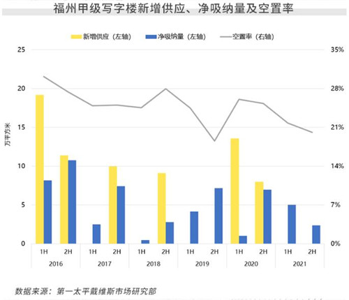 2021年,福州寫字樓各子市場(chǎng)需求表現(xiàn)呈分化趨勢(shì),部分片區(qū)受項(xiàng)目產(chǎn)權(quán)變更等影響,企業(yè)租戶多有退租,空置率隨之上升;而閩江北則錄得多宗大包租成交,去化表現(xiàn)良好。受上述因素綜合影響,全市年度凈吸納量同比下降7.5%,至7.4萬(wàn)平方米。鑒于年內(nèi)無(wú)新增供應(yīng),需求均于存量項(xiàng)目中釋放,全市空置率環(huán)比下降1.7個(gè)百分點(diǎn),至20.1%。