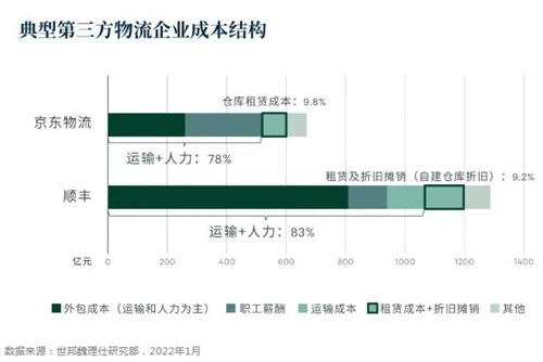 由于運輸和人力占三方物流企業(yè)80%的總成本,房地產(chǎn)成本占比只有10%左右,因而物流企業(yè)每降低1%運輸和人力開支,理論上對應可以抵消8-9%的倉庫租賃開支的增長。