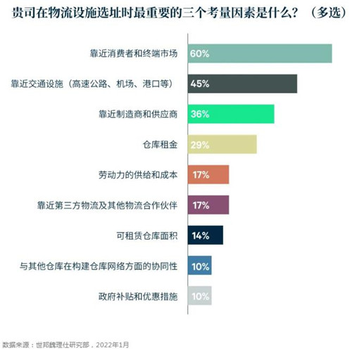 此次調(diào)查的一項重要發(fā)現(xiàn)是:倉儲區(qū)位優(yōu)先于租金成為受訪企業(yè)倉庫選址的共識。分行業(yè)來看,90%電商和零售商認為物流設施需要靠近終端消費市場。而90%的三方物流選擇靠近消費者和終端市場以及靠近交通設施。