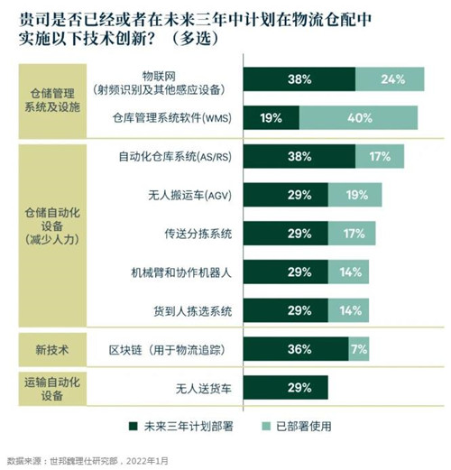 我們的調(diào)查發(fā)現(xiàn),除了倉庫管理系統(tǒng)軟件(WMS)已經(jīng)有40%受訪企業(yè)部署使用,其他物流倉配科技的普及率仍然偏低。未來三年內(nèi),射頻識別技術(38%)、自動化倉庫系統(tǒng)AR/RS(38%)和用于物流追蹤的區(qū)塊鏈技術(36%)是租戶最希望投入使用的創(chuàng)新技術。