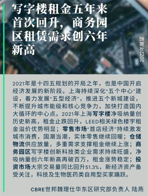 CBRE華東區(qū)顧問及交易服務(wù)|辦公樓部負(fù)責(zé)人張?jiān)奖硎荆?021年上海寫字樓需求展露強(qiáng)勁復(fù)蘇表現(xiàn),并充分展示了上海市場(chǎng)對(duì)新興產(chǎn)業(yè)戰(zhàn)略布局的全國(guó)引領(lǐng)地位和對(duì)外開放窗口城市的外資吸附力。頭部金融、互聯(lián)網(wǎng)+及高精尖屬性的制造企業(yè)等新進(jìn)賽道落戶上海,外資占比持續(xù)攀升。未來(lái)六個(gè)月,寫字樓市場(chǎng)預(yù)計(jì)將有87萬(wàn)左右新增體量入市,包括多個(gè)期待已久的優(yōu)質(zhì)項(xiàng)目,集中分布于“一江一河”沿岸濱水地區(qū)的徐匯濱江、前灘、北外灘及蘇河灣,為2022年快速承接國(guó)際大都市發(fā)展能級(jí)和核心競(jìng)爭(zhēng)力集中展示區(qū)的提質(zhì)轉(zhuǎn)型需求提供充沛優(yōu)質(zhì)辦公場(chǎng)所選擇。近期,包括14號(hào)線在內(nèi)多條升級(jí)市區(qū)通達(dá)性的地鐵開通,進(jìn)而促進(jìn)浦東、浦西商務(wù)板塊間聯(lián)動(dòng),有望再助推城市多元格局發(fā)展。