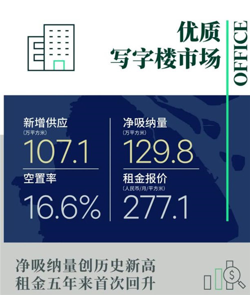 2021年寫字樓市場(chǎng)共錄得17個(gè)新項(xiàng)目入市,總計(jì)107.1萬(wàn)平方米,為去年交付體量的1.6倍,其中六成布局新興商務(wù)區(qū),以黃金三角2.0——“世博—前灘—徐匯濱江“為代表濱江核心發(fā)展區(qū)的成熟度加速進(jìn)化!笆奈濉笔沁~入產(chǎn)業(yè)數(shù)字化轉(zhuǎn)型關(guān)鍵階段的元年,上海凈吸納量創(chuàng)下歷史新高,達(dá)129.8萬(wàn)平方米。搬遷擴(kuò)租需求提速釋放,貢獻(xiàn)七成全年新租活動(dòng),其中品質(zhì)升級(jí)在優(yōu)質(zhì)供應(yīng)放量之下占比超30%。值得一提的是,第四季度核心區(qū)位成熟商務(wù)氛圍和租金合理化驅(qū)動(dòng)下,已然出現(xiàn)“再中心化”區(qū)位升級(jí)趕超“去中心化”的態(tài)勢(shì),核心商務(wù)區(qū)凈吸納量加速提升,較第三季度增加5%,南京西路和淮海中路帶動(dòng)明顯。供需關(guān)系改善下,全市空置率同比顯著下降3.0百分點(diǎn),至16.6%。