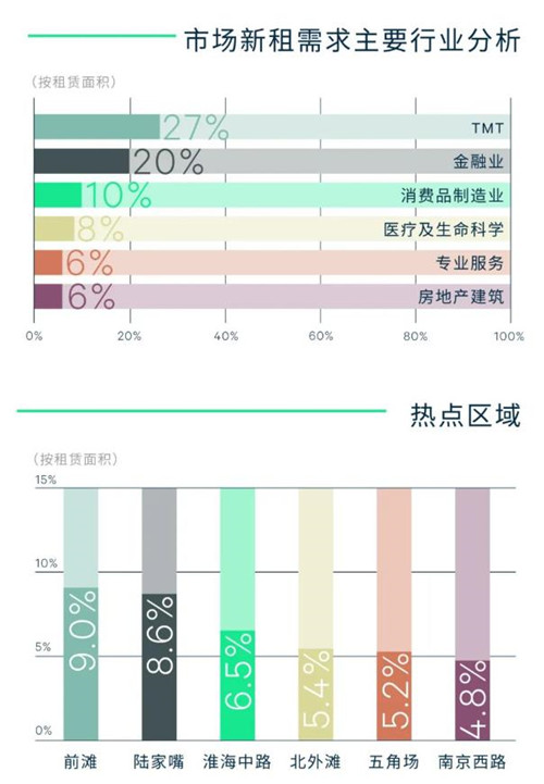 行業(yè)需求方面,上海以強(qiáng)勁勢(shì)頭迎接數(shù)字經(jīng)濟(jì)時(shí)代,以電商、社交媒體以及人工智能、大數(shù)據(jù)及金融科技等細(xì)分類別主導(dǎo)的TMT需求仍以超1/4的水平位列全年首位;其次,伴隨浦東“引領(lǐng)區(qū)”政策的出臺(tái),以融資租賃、基金、銀行、保險(xiǎn)為主的金融業(yè)升級(jí)擴(kuò)租明顯,70%選址浦東。而資本推動(dòng)、消費(fèi)回流和代際更迭疊加效應(yīng)之下,互聯(lián)網(wǎng)+屬性的快消及奢侈品為代表的消費(fèi)品制造業(yè),與“專精特新”相關(guān)的生物醫(yī)藥企業(yè)擴(kuò)張愈加活躍,外資需求錄得顯著回升。此外,律所為首的專業(yè)服務(wù)和第三方辦公服務(wù)運(yùn)營(yíng)商年內(nèi)亦持續(xù)穩(wěn)健布局。