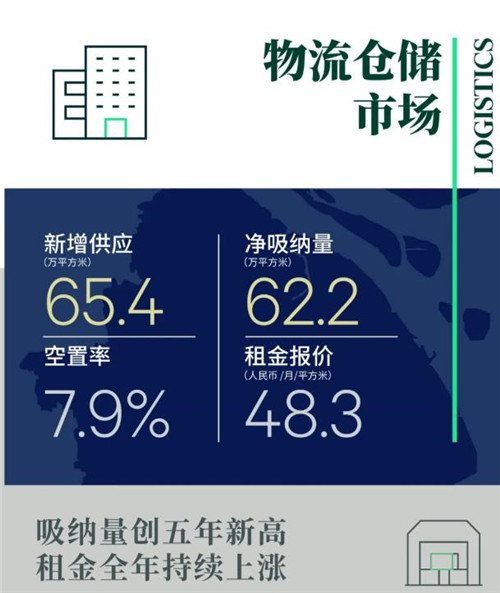 2021年上海物流倉(cāng)儲(chǔ)市場(chǎng)共錄得四個(gè)項(xiàng)目,迎來(lái)65.4萬(wàn)平方米的新增供應(yīng),達(dá)到五年內(nèi)歷史值的最高峰,其中兩個(gè)大體量項(xiàng)目落入金山。需求端而言,第三方物流主導(dǎo)全年成交,租賃成交面積占比超過(guò)80%,物流企業(yè)進(jìn)入整合重組的綜合發(fā)展時(shí)期,多家新勢(shì)力瞄準(zhǔn)供應(yīng)鏈方向,加速基礎(chǔ)設(shè)施布局,出現(xiàn)頭部企業(yè)連續(xù)季度進(jìn)行擴(kuò)租或物流園區(qū)整租行為;消費(fèi)線上購(gòu)物節(jié)的熱潮及多種電商形式的衍化,提升年中和年末電商和寄遞企業(yè)的倉(cāng)儲(chǔ)租賃活躍度;社區(qū)團(tuán)購(gòu)和生物醫(yī)藥相關(guān)需求推動(dòng)冷庫(kù)租賃熱度攀升。年末全市凈吸納量錄得62.2萬(wàn)平方米,同比增長(zhǎng)130%。