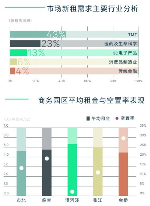 行業(yè)需求方面,TMT行業(yè)的租賃需求以43%穩(wěn)居第一,其中作為主力需求的游戲類企業(yè)在行業(yè)聚集性強(qiáng)的漕河涇大量搬遷、擴(kuò)租及新設(shè)總部;電商相關(guān)企業(yè)選擇在市北及臨空完成升級(jí)置換;互聯(lián)網(wǎng)、通訊類租戶也錄得一定面積成交。生物醫(yī)藥以23%的占比位列第二,其中張江板塊承接了過(guò)半的成交面積,政策導(dǎo)向效果顯著,產(chǎn)業(yè)集聚效應(yīng)進(jìn)一步加強(qiáng);得益于生物醫(yī)藥特色商務(wù)園區(qū)的交付,浦江板塊同樣表現(xiàn)出強(qiáng)勁的吸引力。半導(dǎo)體、電子設(shè)備及芯片類企業(yè)的發(fā)展推動(dòng)電子產(chǎn)品類租戶成交占比達(dá)13%,較上一年有明顯提高,集中表現(xiàn)在張江板塊,金橋、浦江板塊均有大面積成交。