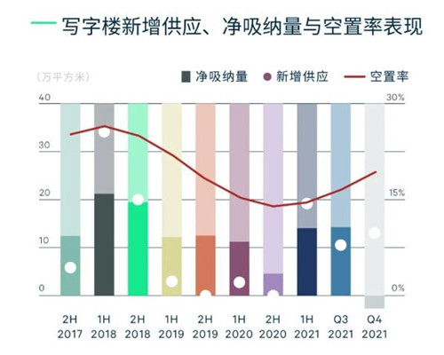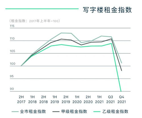租賃市場(chǎng)穩(wěn)步發(fā)展,客戶方市場(chǎng)特征嶄露頭角。房地產(chǎn)“三道紅線”政策下,鄭州房地產(chǎn)租賃市場(chǎng)出現(xiàn)大面積退租及減租表現(xiàn),“雙減”政策下,在線教培行業(yè)業(yè)務(wù)收縮,波及第四季度全市寫字樓市場(chǎng)凈吸納量呈現(xiàn)負(fù)增長(zhǎng)趨勢(shì)。全市寫字樓凈吸納量錄得負(fù)2.6萬平方米。市場(chǎng)活躍度降低,去化率減弱,凈吸納量出現(xiàn)負(fù)增長(zhǎng),CBRE預(yù)判2022年市場(chǎng)將逐步進(jìn)入客戶方市場(chǎng)。
