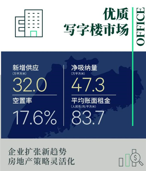 需求顯著回暖,寫字樓吸納量錄得約47萬平方米,同比大幅上漲127.6%,居全國第六位。但全年市場呈先揚后抑的態(tài)勢,農歷新年后商務活動快速回暖,上半年吸納量占比全年的71.9%;下半年市場活躍度逐步走低,其中四季度吸納量環(huán)比下跌近九成,原因在于疫情反復令租戶持更謹慎態(tài)度,以及包括科技、房地產在內的行業(yè)調整,引發(fā)小波退租潮。盡管如此,市場空置率仍不斷改善,同比下降2.7個百分點至17.6%,系自2005年來的新低。