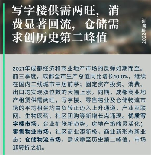 展望未來,由于中國經濟正加速推動新舊動能轉化以實現長期高質量發(fā)展,各行業(yè)積極尋求新發(fā)展方向,或將維持調整基調,預計2022年成都寫字樓需求增長或有所放緩;但中長期來看,需求仍呈上升趨勢。