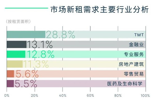 分行業(yè)和區(qū)域看,鑒于政策引導、產業(yè)集聚、可租賃面積充裕及成本因素,2021年各行業(yè)跨區(qū)域靈活性表現各異。在傳統(tǒng)商務區(qū)和城東北,金融業(yè)和TMT的需求同比增長最為顯著;而在金融城、大源,生命科學、零售貿易需求同比增長最顯著。