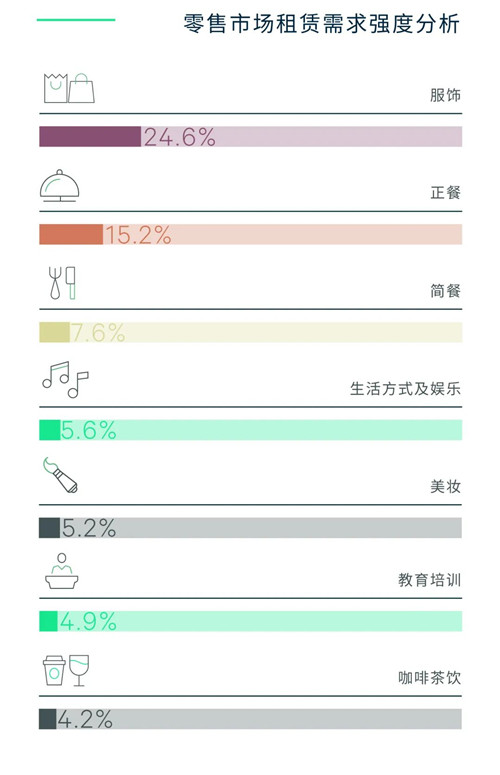 2021年,零售新增需求占比50%。連鎖服飾品牌擴張放緩,取而代之的是凸顯獨立個性的服飾積極擴張,如買手店、獨立設計師品牌,或獨立男裝集合店等。為進一步引發(fā)潮流,服飾品牌紛紛在成衣和店鋪設計上走“本土化”策略,并發(fā)力社群營銷。悅己趨勢延續(xù),歐美系高化品牌積極擴張,而內資美妝集合店則逐步邁入飽和期。次文化大行其道,衍生強勁的相關消費需求,如該類文化的服飾、潮玩甚至是電子設備。