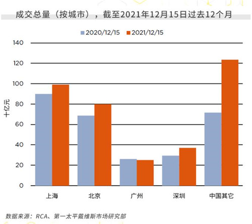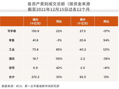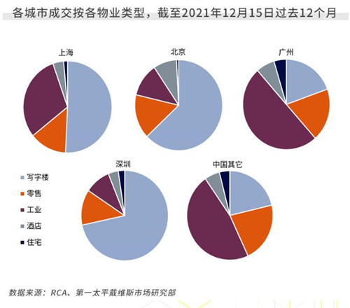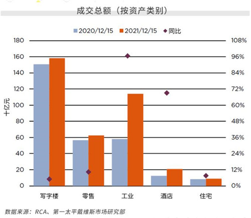 成交量在過去12個月內(nèi)(截至2021年12月15日)同比上升10%,境內(nèi)買家占比達三分之二。主要成交包括平安保險收購來福士資產(chǎn)包,其中包括位于上海、寧波、成都、杭州和北京的六個來福士廣場項目;以及城市發(fā)展出售協(xié)信資產(chǎn)包,其中包括在重慶、上海、鎮(zhèn)江的八個購物中心。
