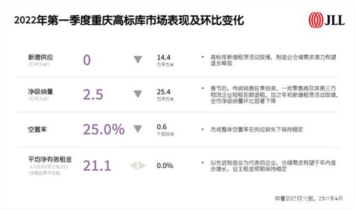 2022年第一季度,重慶高標(biāo)庫市場未錄得新項(xiàng)目入市。季度內(nèi)高標(biāo)庫新增租賃活動(dòng)放緩,制造業(yè)倉儲(chǔ)需求潛力有望逐步釋放。春節(jié)后,傳統(tǒng)銷售旺季結(jié)束,一批零售商及其第三方物流企業(yè)短租到期退租,加之年初新增租賃活動(dòng)放緩,全市凈吸納量環(huán)比下降至2.5萬平方米。市場整體空置率在供應(yīng)缺失下保持穩(wěn)定,環(huán)比微降0.6個(gè)百分點(diǎn),至25.0%。平均凈有效租金較上季度保持穩(wěn)定,報(bào)21.1元每平方米每月。