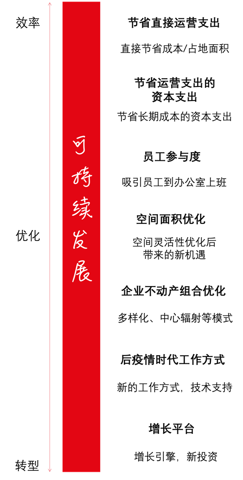 驅(qū)動(dòng)因素:下圖反映了企業(yè)的業(yè)務(wù)戰(zhàn)略與對(duì)應(yīng)的辦公場(chǎng)所策略。圖表左側(cè)的業(yè)務(wù)戰(zhàn)略從上方的“效率”開始,一直到下方的“轉(zhuǎn)型”,分別展示對(duì)應(yīng)采取的辦公場(chǎng)所策略,并且皆以“可持續(xù)發(fā)展”做為終極目標(biāo)。同時(shí),具體哪些策略能夠應(yīng)用、及應(yīng)用的優(yōu)先級(jí),也受到所處行業(yè)、細(xì)分市場(chǎng)、地域、文化和疫情的影響。
