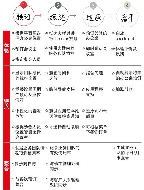 下圖展示了仲量聯(lián)行為客戶開發(fā)的體驗(yàn)路徑圖示例,用于幫助確定辦公室預(yù)訂應(yīng)用程序需包含哪些功能。