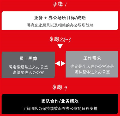 以上六大要素能夠幫助企業(yè)了解如何打造混合辦公場(chǎng)所,下圖是確定企業(yè)需求并打造混合辦公場(chǎng)所的建議步驟。企業(yè)應(yīng)尋找能夠滿足自身員工特定需求的混合辦公策略,確保員工和團(tuán)隊(duì)在辦公室發(fā)揮應(yīng)有的績效。仲量聯(lián)行認(rèn)為,混合辦公模式打造沒有一個(gè)確定之法,“以人為本”地了解員工需求,可以幫助制定正確的混合辦公策略,讓辦公場(chǎng)所的設(shè)計(jì)與員工及團(tuán)隊(duì)的需求保持一致。