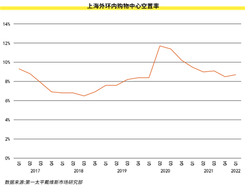 上海市區(qū)零售市場(chǎng)2022年第一季度無(wú)新增供應(yīng)入市,外環(huán)內(nèi)購(gòu)物中心和百貨存量維持在1,484萬(wàn)平方米。2022年第一季度外環(huán)內(nèi)購(gòu)物中心平均租金較上季度持平為26.5元;空置率環(huán)比上漲0.2個(gè)百分點(diǎn)至8.7%,較去年同期下降0.8個(gè)百分點(diǎn)。部分大面積餐飲和快時(shí)尚品牌租約到期,核心商圈與非核心商圈空置率分別上升0.7和0.1個(gè)百分點(diǎn)。一季度通常為零售市場(chǎng)淡季,加之無(wú)新項(xiàng)目開(kāi)業(yè),市場(chǎng)活躍度受此因素影響有所放緩。但新租品牌需求中個(gè)人護(hù)理和生活方式子品類面積占比增長(zhǎng)仍較為顯著。