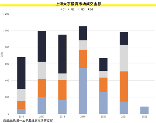 受疫情反復(fù)及動(dòng)蕩的國(guó)際局勢(shì)影響,2022年第一季度上海投資市場(chǎng)整體活躍度較低,共完成八宗大宗成交,合計(jì)成交金額達(dá)人民幣84億元。除自用成交以外,大部分市場(chǎng)成交為“新經(jīng)濟(jì)”板塊物業(yè)成交,第一季度市場(chǎng)有三宗工業(yè)物業(yè)及一宗園區(qū)物業(yè)成交,成交總額占總成交額的38%。大部分投資者對(duì)傳統(tǒng)型物業(yè)(寫(xiě)字樓及零售)仍保持謹(jǐn)慎的態(tài)度,且對(duì)價(jià)格較敏感。四月初,太平洋房屋以低至人民幣13.95億元收購(gòu)了綠地瀛通大廈一棟大廈,收購(gòu)單價(jià)相當(dāng)于9年前恒豐銀行收購(gòu)該物業(yè)另一棟大廈價(jià)格的約六折。