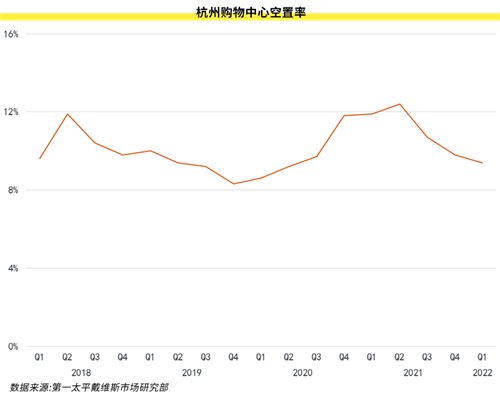 受疫情延誤影響,2022年第一季度杭州零售市場無新項目入市,全市優(yōu)質(zhì)購物中心存量維持在580萬平方米。全市優(yōu)質(zhì)購物中心首層租金保持穩(wěn)定,達(dá)人民幣15.2元每平方米,盡管過去三個月租金未發(fā)生較大變化,但隨著嘉里中心、湖濱銀泰和萬象城等核心項目經(jīng)過一系列租戶組合及運(yùn)營升級后,這些項目預(yù)計會在未來幾個季度實現(xiàn)租金上漲。同時,第一季度全市優(yōu)質(zhì)購物中心空置率環(huán)比下降0.4個百分比,達(dá)到9.4%,考慮到2022年亞運(yùn)會前后市場將有大量新增供應(yīng),業(yè)主都在想方設(shè)法降低項目空置率。