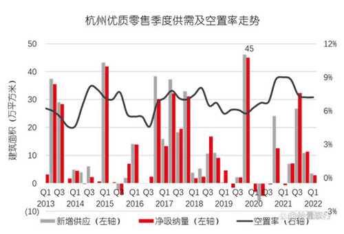 2022年第一季度,杭州甲級(jí)辦公樓市場(chǎng)無(wú)新增供應(yīng),年前積壓的需求在一季度集中釋放,整體空置率略有下降?萍蓟ヂ(lián)網(wǎng)行業(yè)繼續(xù)驅(qū)動(dòng)辦公市場(chǎng)需求,房地產(chǎn)建筑行業(yè)及零售貿(mào)易行業(yè)在總租賃成交中占比上升。優(yōu)質(zhì)零售物業(yè)市場(chǎng)方面,一季度新增一個(gè)零售項(xiàng)目,總體空置率保持平穩(wěn)。其中時(shí)尚業(yè)態(tài)繼續(xù)主導(dǎo)市場(chǎng)需求,運(yùn)動(dòng)品牌和時(shí)尚潮牌擴(kuò)張明顯,娛樂(lè)業(yè)態(tài)涌現(xiàn)出新的市場(chǎng)需求。