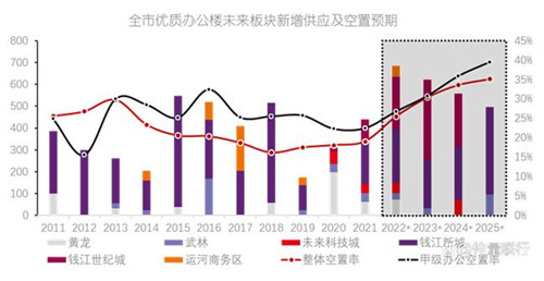 統(tǒng)觀全年,杭州預(yù)計(jì)有68萬(wàn)平方米的新增供應(yīng),共計(jì)12個(gè)優(yōu)質(zhì)項(xiàng)目入市。新入市項(xiàng)目主要集中在錢江新城及錢江世紀(jì)城板塊,其中甲級(jí)辦公樓市場(chǎng)新增體量約27萬(wàn)平方米。較大的新增供應(yīng)將導(dǎo)致空置率承壓上升,預(yù)計(jì)杭州甲級(jí)辦公樓的空置率在2022年底或?qū)⑦_(dá)到26.8%,同比上升5個(gè)百分點(diǎn),達(dá)到近三年來(lái)的最高水平。未來(lái)三年,預(yù)計(jì)杭州辦公樓的新增供應(yīng)將始終保持高位,總體空置率在2023年后將上升至30%以上。