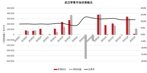 租金整體較平穩(wěn),空置率小幅上升。目前武漢零售業(yè)市場(chǎng)處于疫情之后的恢復(fù)期,2021年,我市實(shí)現(xiàn)社會(huì)消費(fèi)品零售總額6,795.04億元,比上年增長(zhǎng)10.5%,增速明顯,但并未完全恢復(fù)到2019年的水平。與2019年相比,餐飲業(yè)營業(yè)額增長(zhǎng)了12.4%,基本恢復(fù)并有所提升。業(yè)主方也在積極恢復(fù)原有的租金水平,今年一季度,武漢優(yōu)質(zhì)零售市場(chǎng)凈有效租金呈平穩(wěn)趨勢(shì),全市首層非主力店凈有效租金環(huán)比微升0.2%,至380元每平方米每月。但受到整體消費(fèi)動(dòng)力、品牌擴(kuò)張速度以及未來供應(yīng)等因素影響,總體恢復(fù)態(tài)勢(shì)保持穩(wěn)中有進(jìn)。