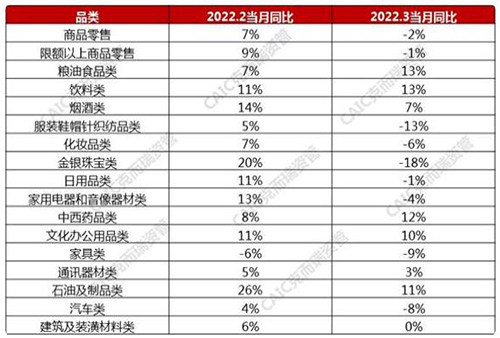 表:2022 年 2-3 月社零細(xì)分品類同比增長(zhǎng)(%)