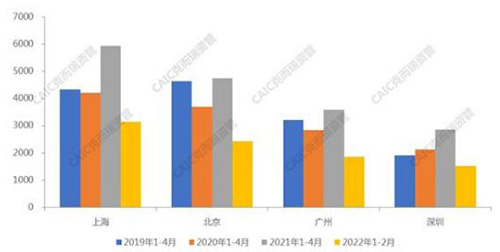 2020 年 1-2 月以來(lái),隨著疫情的穩(wěn)定,四個(gè)一線城市消費(fèi)零售顯著復(fù)蘇。22 年 1-2 月份,在四個(gè)一線城市爆發(fā)疫情之前,社會(huì)消費(fèi)品零售總額增速均保持較好態(tài)勢(shì)。22 年 3-4 月,四大一線城市逐步進(jìn)入封控期,消費(fèi)陷入停擺。參考往年 3-4 月平均水平,上海受影響最大,或?qū)⒊^(guò) 2000 億元。