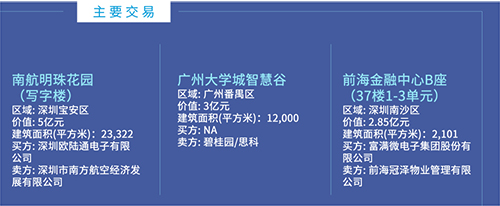 深圳方面,深圳歐陸通電子以5億元購得南航明珠花園寫字樓。另一筆涉及自用買家的交易是前海金融中心的一整層樓,以2.85億元售出。
