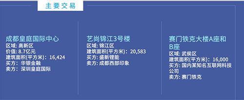 成都方面,華銀金融以總對價8.7億元與位于高新區(qū)的皇庭國際中心完成股權(quán)合作。盛新鋰能購得藝尚錦江3號樓作為其成都總部。賽門鐵克成都公司將其位于高新區(qū)天府四街的兩棟辦公樓出售給國內(nèi)某知名互聯(lián)網(wǎng)科技公司。