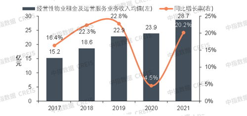 隨著疫情進(jìn)入常態(tài)化防控階段,2020年廣泛采取的租金減免政策逐步退出,2021年,百?gòu)?qiáng)代表企業(yè)經(jīng)營(yíng)性物業(yè)租金及運(yùn)營(yíng)服務(wù)收入均值為28.7億元,在上年低基數(shù)下,同比增長(zhǎng)20.2%,兩年平均增長(zhǎng)12.1%。
