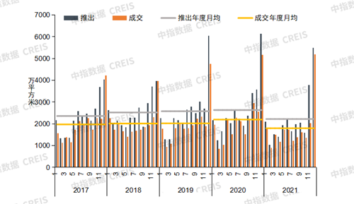 2017-2021年300城商辦用地推出及成交規(guī)劃建筑面積