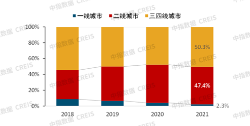 在需求趨弱以及資金壓力增加等因素影響下,商業(yè)地產(chǎn)企業(yè)投資布局更趨謹(jǐn)慎。2021年,商業(yè)地產(chǎn)百?gòu)?qiáng)代表企業(yè)平均新增純商辦用地規(guī)模較2020年明顯收縮。從新增商辦用地分布看,百?gòu)?qiáng)代表企業(yè)新增商辦用地在一線(xiàn)城市的占比下降1.8個(gè)百分點(diǎn)至2.3%,二線(xiàn)城市占比下降0.8個(gè)百分點(diǎn)至47.4%,三四線(xiàn)城市占比增加2.6個(gè)百分點(diǎn)至50.3%。