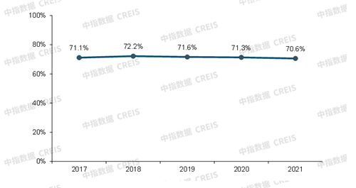 商業(yè)地產(chǎn)百?gòu)?qiáng)代表企業(yè)資產(chǎn)負(fù)債率小幅下降,位于合理區(qū)間。2021年,商業(yè)地產(chǎn)百?gòu)?qiáng)代表企業(yè)資產(chǎn)負(fù)債率均值為70.6%,較2020年小幅下降0.7個(gè)百分點(diǎn)?傮w來(lái)看,商業(yè)地產(chǎn)百?gòu)?qiáng)代表企業(yè)積極降負(fù)債的同時(shí),通過(guò)穩(wěn)步的規(guī)模擴(kuò)張和高質(zhì)量運(yùn)營(yíng)帶來(lái)的收入提升擴(kuò)大資產(chǎn)規(guī)模,實(shí)現(xiàn)穩(wěn)健經(jīng)營(yíng)。