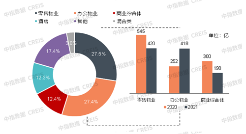 2021年類(lèi)REITs和CMBS/CMBN按底層資產(chǎn)細(xì)分發(fā)行量占比圖片