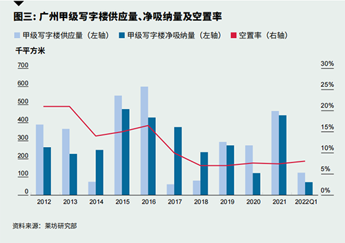 下一季度,全市新增供應(yīng)量將迎來高峰。若能按時(shí)交付,預(yù)計(jì)超48萬平方米,而2021年全年市場(chǎng)供應(yīng)也僅46萬平方米。新項(xiàng)目全部位于琶洲,位于琶洲的粵傳媒大廈, 星河灣中心,廣鋁總部經(jīng)濟(jì)大廈,華新中心等都將竣工交付。因此,空置率或被推高,租金亦將繼續(xù)下探。