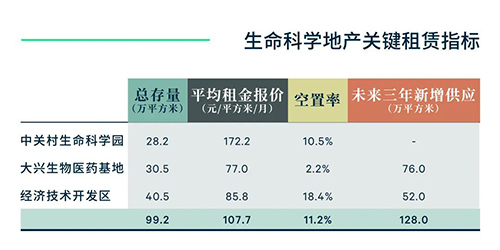 目前北京商務(wù)園區(qū)市場(chǎng)優(yōu)質(zhì)生命科學(xué)地產(chǎn)租賃總存量達(dá)99.2萬(wàn)平方米,占全市優(yōu)質(zhì)商務(wù)園區(qū)可租物業(yè)的10.7%,項(xiàng)目全部位于三大生命科學(xué)園區(qū)。整體生命科學(xué)地產(chǎn)當(dāng)前空置率11.2%,明顯低于整體商務(wù)園區(qū)18.9%的水平,有更優(yōu)的入駐表現(xiàn)。