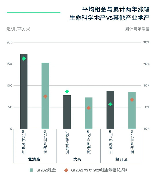 發(fā)展最為成熟的中關(guān)村生命科學(xué)園常年受到新增供應(yīng)短缺的限制,除個(gè)別項(xiàng)目受政府產(chǎn)業(yè)布局規(guī)劃影響,區(qū)域內(nèi)可租賃的優(yōu)質(zhì)項(xiàng)目基本保持滿租狀態(tài)。平均租金位居三大區(qū)域之首,近兩年上漲幅度高達(dá)22.0%,租金相比同商務(wù)園區(qū)子市場(chǎng)其他產(chǎn)業(yè)地產(chǎn)高出12.7%。區(qū)域短期內(nèi)無(wú)新增物業(yè),長(zhǎng)期內(nèi)隨著中關(guān)村生命科學(xué)園三期規(guī)劃落地,區(qū)域供不應(yīng)求的局面有望得到緩解。