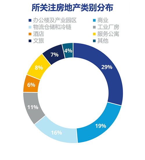 受訪企業(yè)中,前三大關注地產類型分別為辦公樓及產業(yè)園區(qū)、商業(yè)、物流倉儲