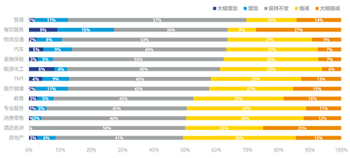 幾乎所有調查中提及的行業(yè),50%以上的受訪者認為所在公司不會減少運營成本的投入。其中,貿易、物流交通、金融保險行業(yè)目前受疫情負面影響較小;值得注意的是,超過12%的汽車、能源化工、TMT及醫(yī)療健康行業(yè)受訪者考慮疫情后增加運營投入,為提振市場釋放積極信號。