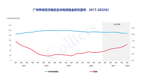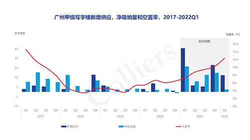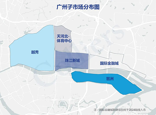 截至2022年一季度,廣州甲級寫字樓市場總存量為617萬平方米,其中珠江新城總存量位居各子市場第一,占比約為全市50%,琶洲市場存量緊隨其后。