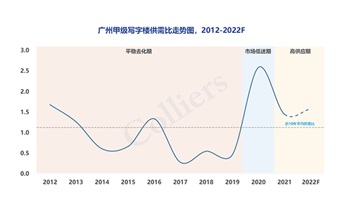 出于疫情原因,2020年廣州市場進入低迷期,市場需求跌入歷史十年低谷。在2021年,凈吸納呈現(xiàn)大幅反彈,同時,市場供應進入高峰期。高力國際預測供應高峰期將持續(xù)至2024年,市場需求會逐漸恢復至常態(tài),供需比走勢將同步有所提升。