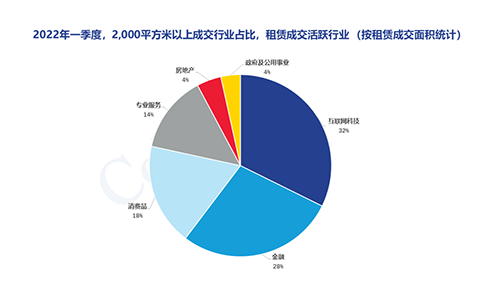 本季度市場需求放緩,錄得凈吸納量2.7萬平方米。市場主要需求集中在互聯(lián)網(wǎng)科技和金融類企業(yè),在本季度2,000平方米以上租賃成交中分別占比32%和28%。在子市場方面,琶洲市場表現(xiàn)最為活躍,以金融和互聯(lián)網(wǎng)企業(yè)租賃交易為主。預計未來三年,琶洲將進入高速發(fā)展時期,多個知名互聯(lián)網(wǎng)總部將在此落戶。此外,根據(jù)2022年發(fā)布的《廣州人工智能與數(shù)字經(jīng)濟試驗區(qū)建設總體方案》,琶洲未來將建設成為廣州人工智能與數(shù)字經(jīng)濟試驗區(qū),互聯(lián)網(wǎng)、人工智能類產(chǎn)業(yè)的聚集效應將會進一步加強。