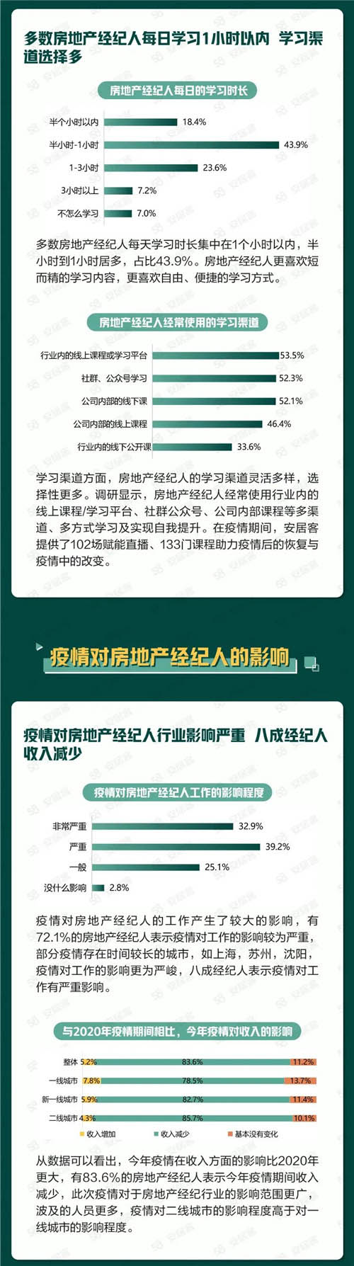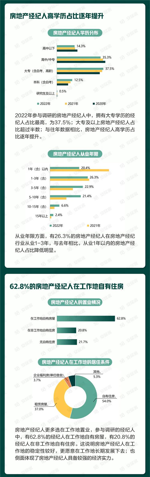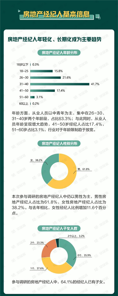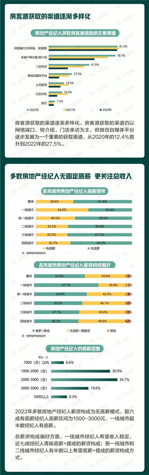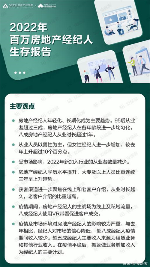 2022年百萬房地產(chǎn)經(jīng)紀(jì)人生存報(bào)告已發(fā)布。數(shù)據(jù)顯示,房地產(chǎn)經(jīng)紀(jì)人從業(yè)人員以男性為主,但女性經(jīng)紀(jì)人進(jìn)一步增加,較去年上升超過10個(gè)百分點(diǎn)。受市場(chǎng)影響,2022年新加入行業(yè)的從業(yè)者數(shù)量減少。房地產(chǎn)經(jīng)紀(jì)人學(xué)歷水平提升,大專及以上人員比重連續(xù)三年呈上升趨勢(shì)。獲客渠道進(jìn)一步聚焦在線上和老客戶介紹,從業(yè)時(shí)長(zhǎng)越久,老客戶介紹的比重越高。