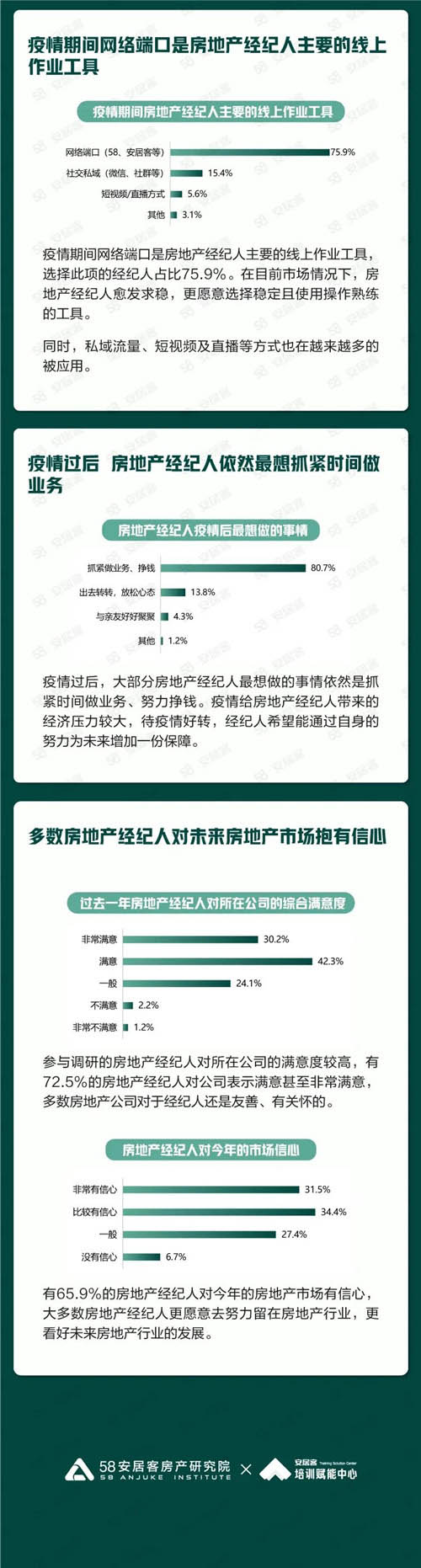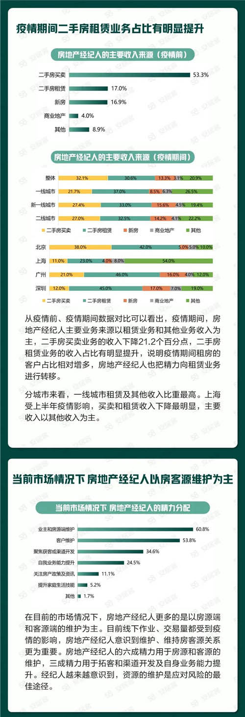 疫情期間,房地產(chǎn)經(jīng)紀(jì)人的主戰(zhàn)場(chǎng)為線上及私域流量,八成經(jīng)紀(jì)人使用VR帶看促進(jìn)客戶成交。疫情及市場(chǎng)環(huán)境對(duì)房地產(chǎn)經(jīng)紀(jì)人的影響較為嚴(yán)重,與去年相比,經(jīng)紀(jì)人對(duì)市場(chǎng)的信心降低, 超八成經(jīng)紀(jì)人疫情期間收入減少。超五成經(jīng)紀(jì)人主要收入來源為租賃業(yè)務(wù)和其他行業(yè)收入。在疫情平穩(wěn)后,抓緊做業(yè)務(wù)增加收入為經(jīng)紀(jì)人的主要計(jì)劃。