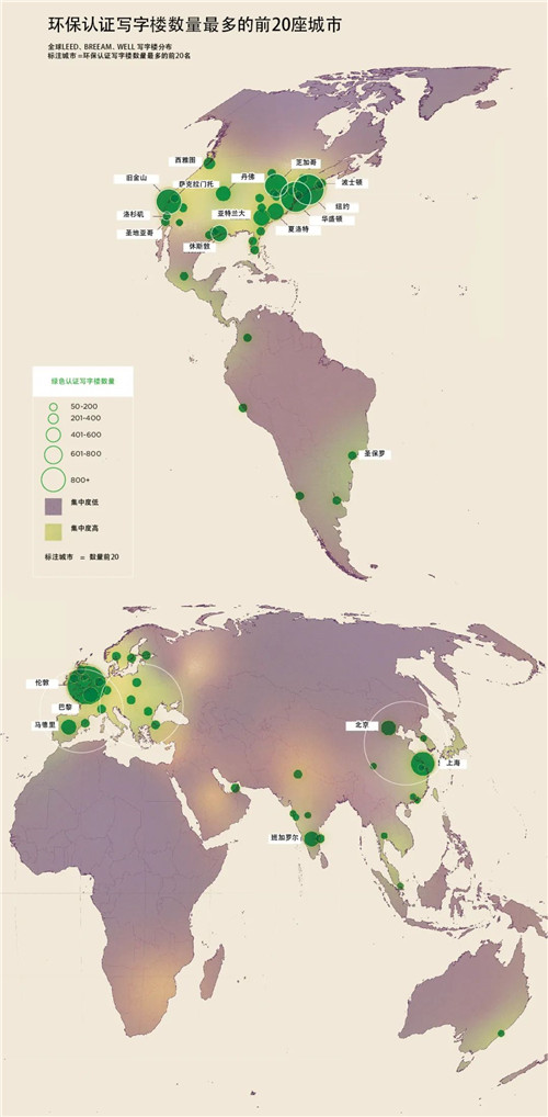 當(dāng)下,用環(huán)境、社會(huì)、治理(ESG)的投入來(lái)重新評(píng)估寫(xiě)字樓對(duì)企業(yè)、員工和投資者來(lái)說(shuō)變得愈發(fā)重要。第一太平戴維斯分析了世界各地LEED、BREEAM及WELL寫(xiě)字樓的分布,揭示在綠色建筑認(rèn)證上最進(jìn)步的城市,在前20的城市排名中美國(guó)城市數(shù)量更多,倫敦、巴黎、北京、上海等熱點(diǎn)商業(yè)城市也榜上有名。