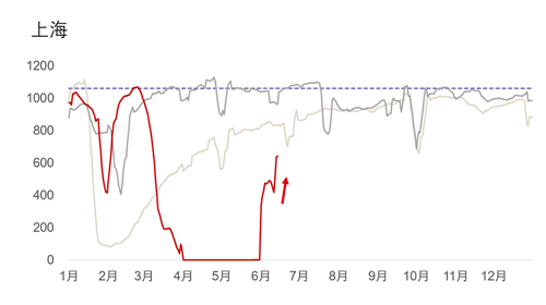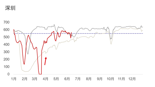 多地陸續(xù)恢復(fù)疫情常態(tài)化管理后,復(fù)工節(jié)奏加快,市場活力重現(xiàn)。地鐵日均客運量是衡量復(fù)工速度的重要指標(biāo)之一。深圳在3月宣布社會面實現(xiàn)動態(tài)清零后,地鐵每日客流量隨之快速回升,目前已基本恢復(fù)至疫情前水平。截至6月13日,上海地鐵日均客運量已恢復(fù)至疫情前60%左右的水平。