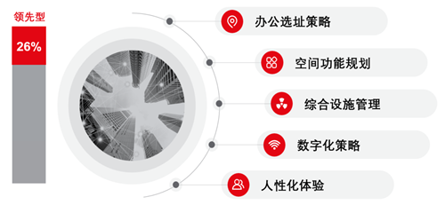 此次問卷覆蓋辦公選址、辦公空間及設(shè)施管理三大話題;趩柧斫Y(jié)果,我們從“辦公選址策略”、“空間功能規(guī)劃”、“綜合設(shè)施管理”、“數(shù)字化策略”及“人性化體驗”五個維度深度剖析企業(yè)不動產(chǎn)決策的內(nèi)在邏輯。我們驚喜地發(fā)現(xiàn),近26%的企業(yè)展現(xiàn)了極富前瞻性的決策思考,這類領(lǐng)先型企業(yè)的決策偏好為未來辦公樓市場發(fā)展提供全新視角。